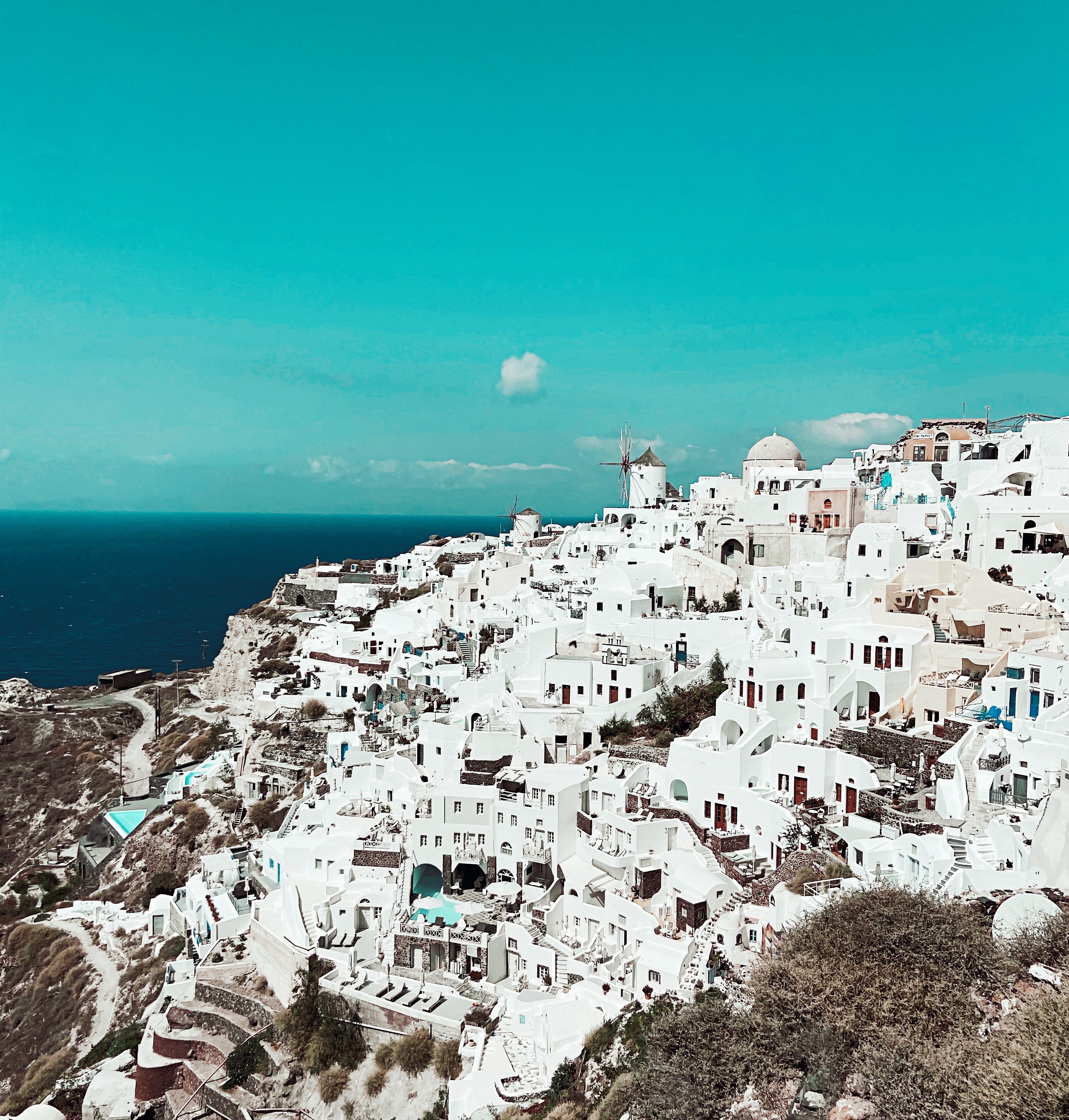 • Oia : Aussi magique qu’en photos, avec ses dômes bleus et ses couchers de soleil spectaculaires. Mention spéciale pour le 218° Café, idéal pour déjeuner ou dîner face à la corniche illuminée.